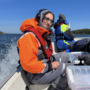 [Image description: A picture of a person on a small boat in the Archipelago, wearing technical gear and a set of headphones to record sound for a film.]