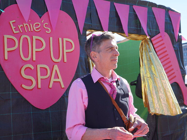 Since 2015, artist Ernest Truely has been developing Ernie’s Pop Up Spa at international art festivals, cultural events as well as on the street. He offers spa services including haircuts and explores themes of care through touch, trust, intimacy and transformation. This edition of Ernie’s Pop Up Spa is produced and presented by Catalysti at the World Village Festival.